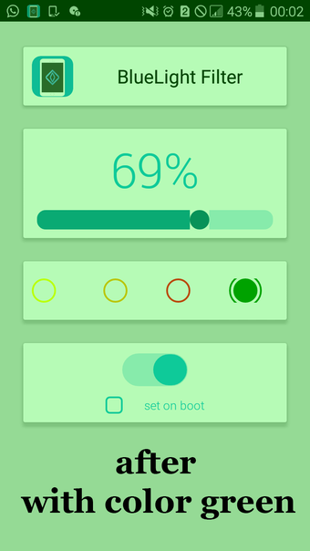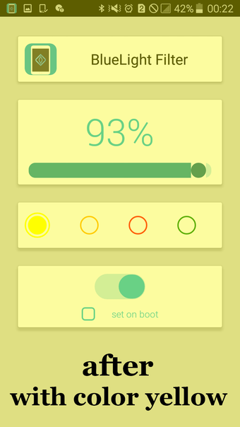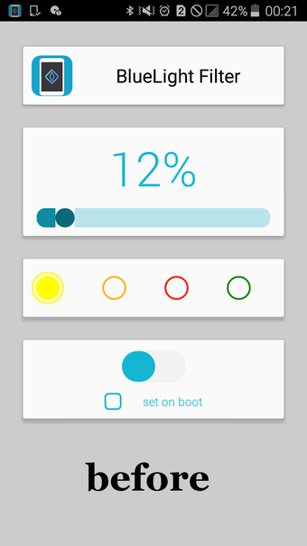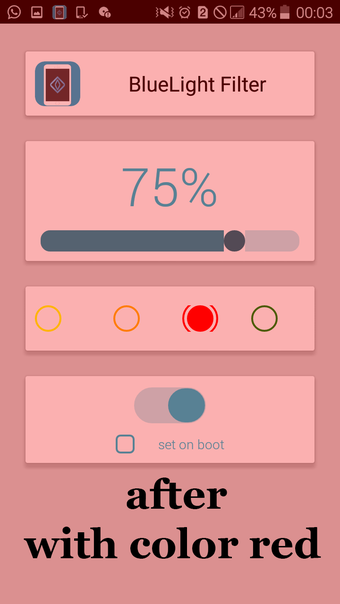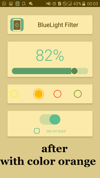 Aplikasi ini tidak mengurangi kecerahan layar tetapi menyesuaikan warna layar untuk mengurangi cahaya biru yang menyebabkan ketegangan pada mata Anda.